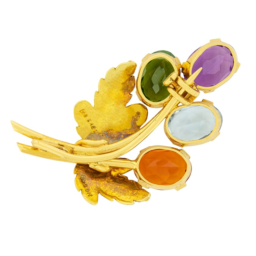 A lovely bouquet of gemstones adorn this 1970s brooch. Four gemstones are featured- an amethyst, citrine, blue topaz and a green topaz. Each gemstone is about 1.00 carat. The leaves are gracefully carved out of 18 carat yellow gold. This is a pretty vintage brooch, perfect for an occasion or everyday wear.