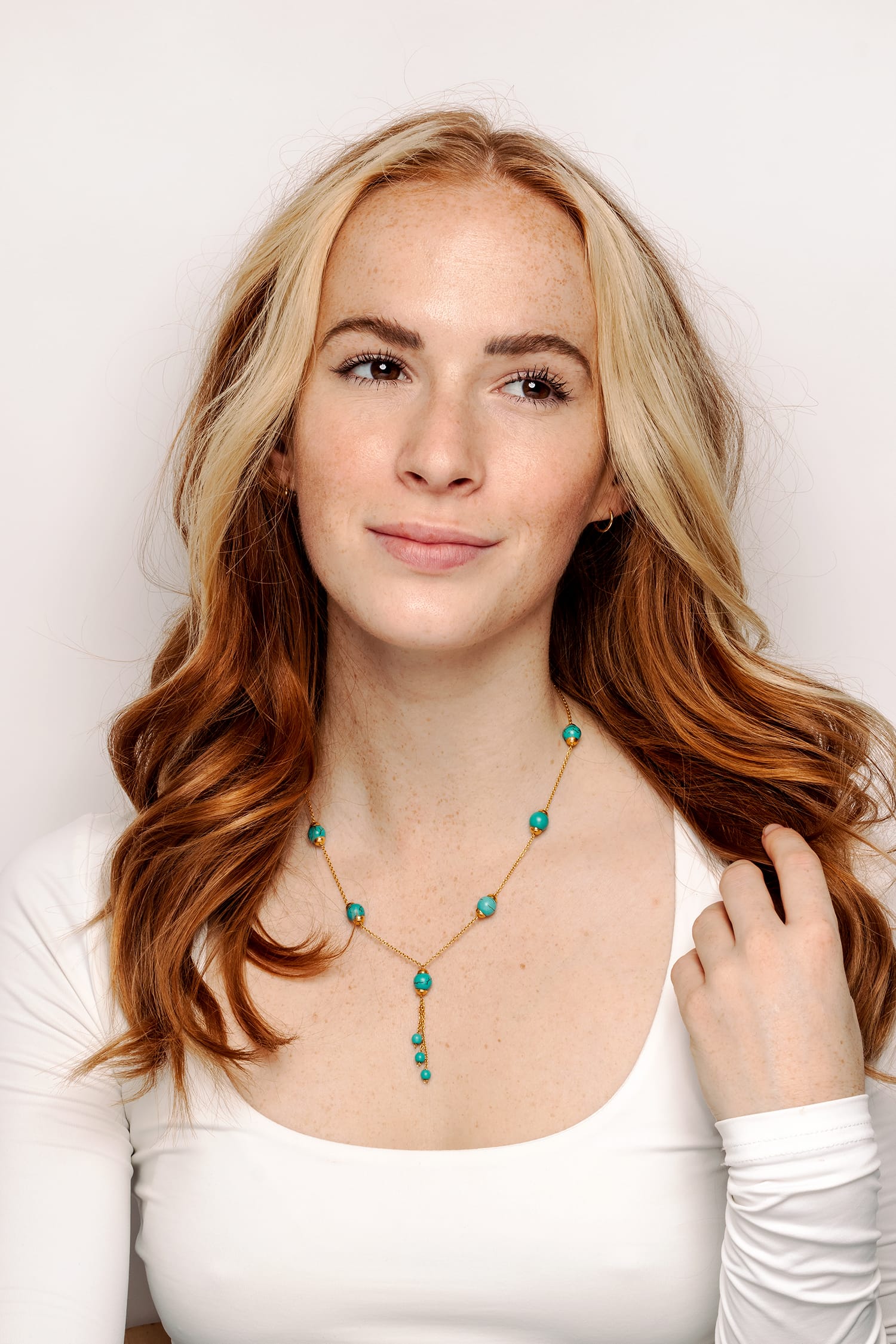 This wonderfully unique necklace features a total of ten turquoise. Seven of the turquoise are evenly spread along the 17″ long 18 carat yellow gold necklace. They all measure 8mm in diameter. The other three turquoise are smaller, at 4.5mm and dangle gracefully from the centre. This centrepiece adds a further 3″ to the necklace. A set of matching earrings can be found for this necklace under the code E200. Together they create a beautiful set for any occasion.