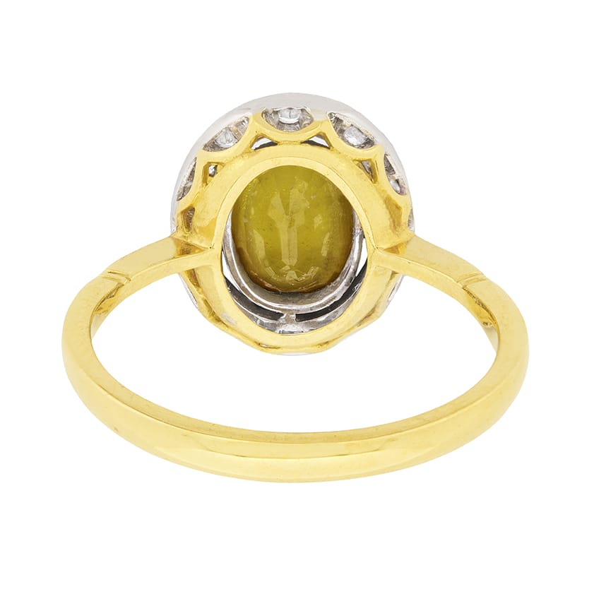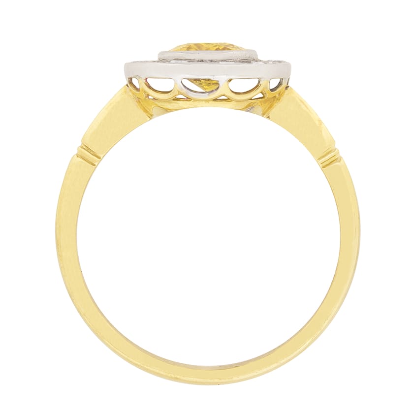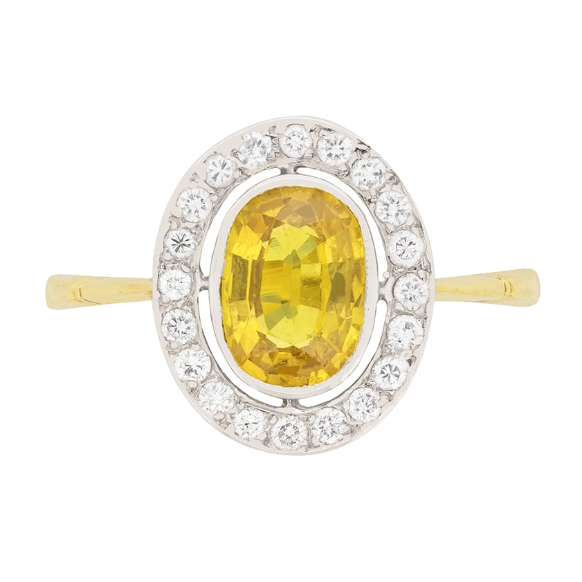 Dating to the 1950s, this halo ring features an oval sapphire which is a bright yellow. It is a natural stone which weighs 1.60 carat, set within a tub over setting. In the halo are 20 round brilliant diamonds, each weighing 0.01 carat; the total weight is 0.20 carat. They are estimated as G in colour and VS in clarity. The setting work is 18 carat white gold, whilst the gallery and shank are in 18 carat yellow gold.